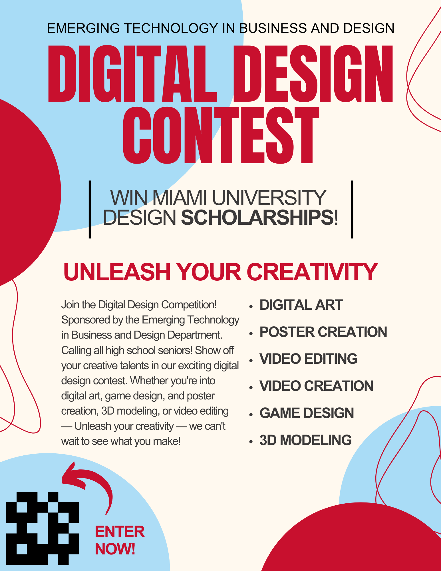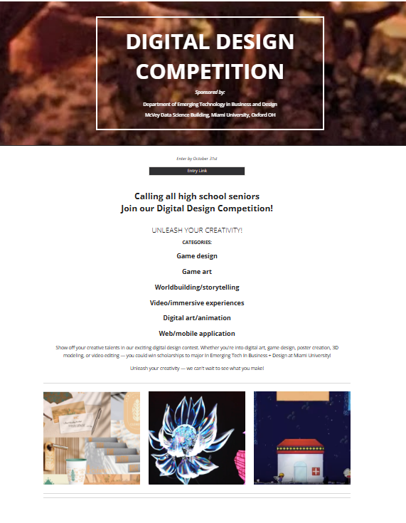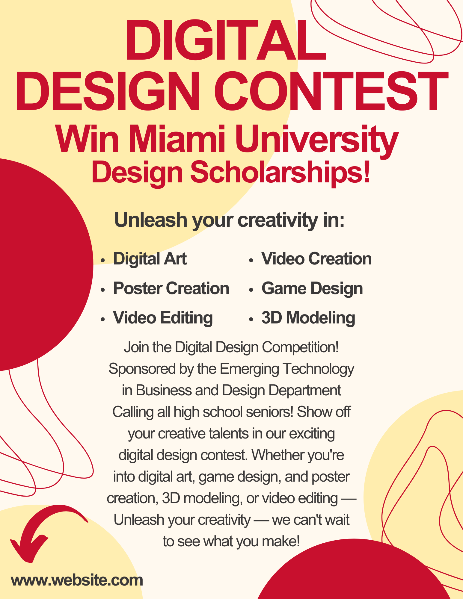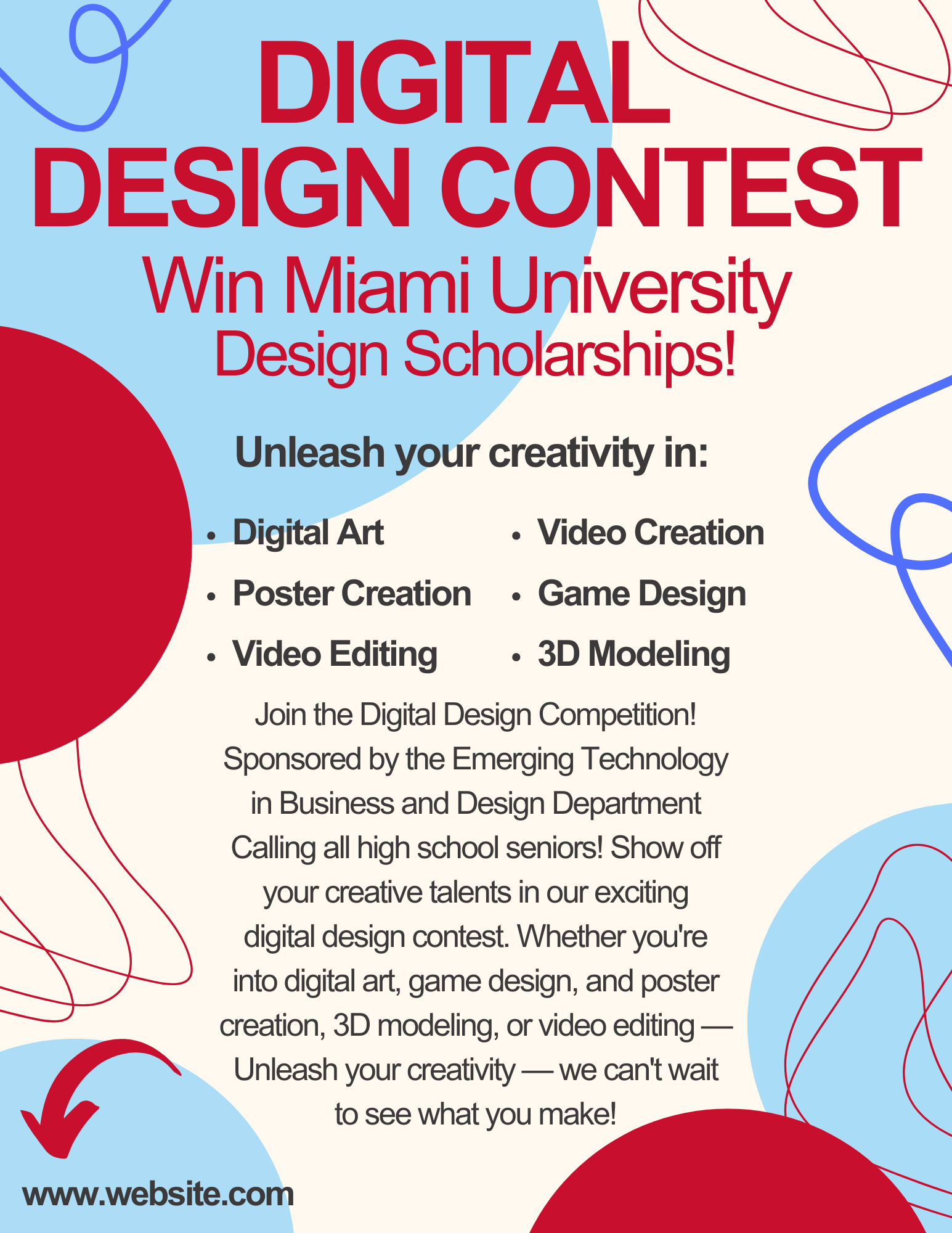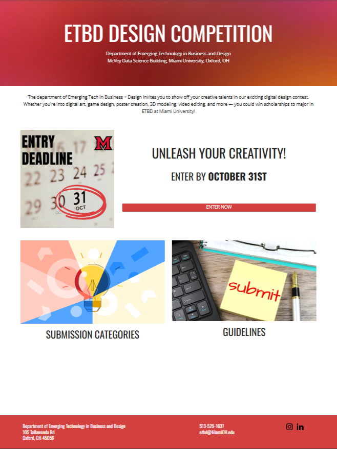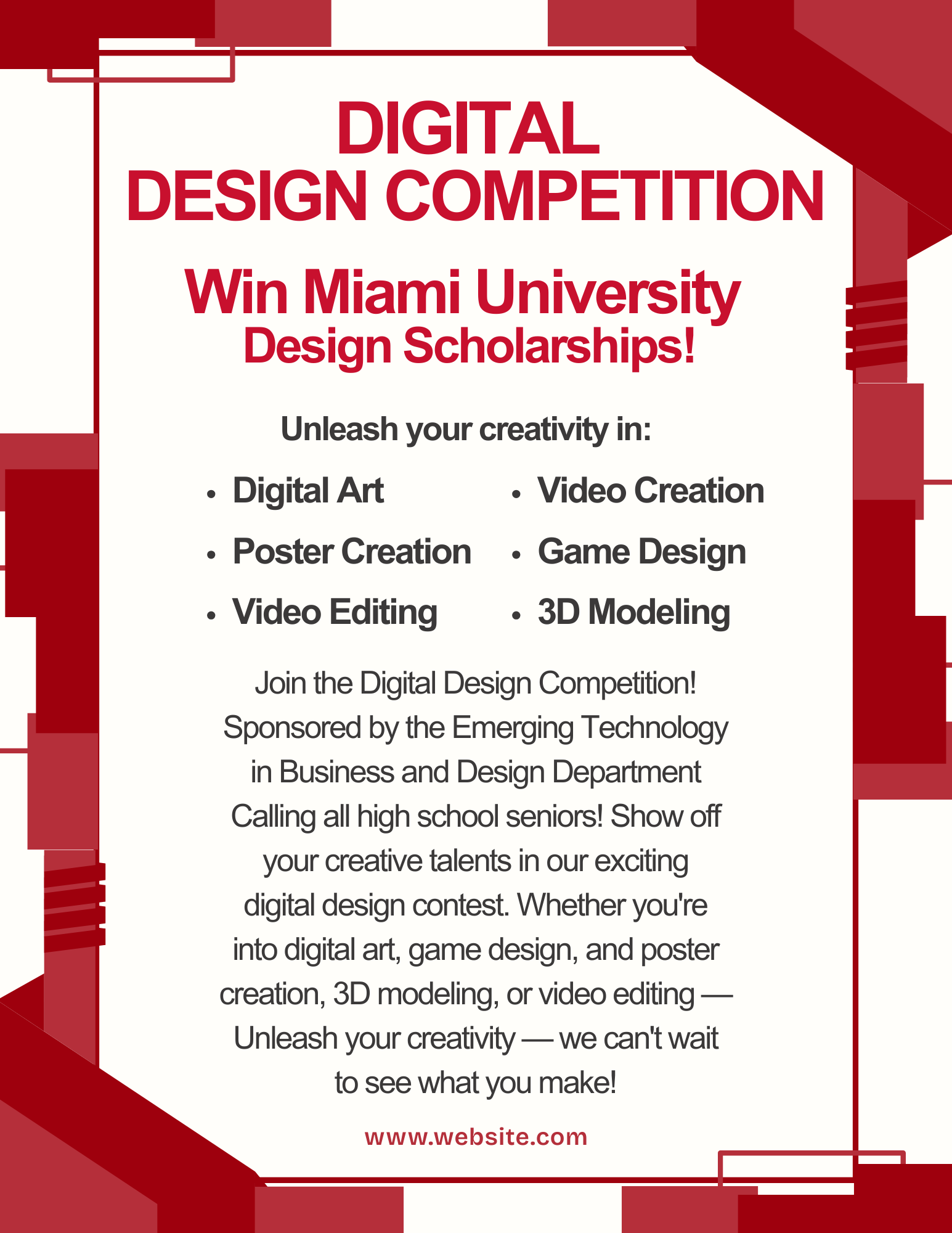 For this project, I collaborated with a partner to design promotional materials for Miami University’s ETBD Digital Design Competition, an initiative aimed at engaging high school students in creative fields. Our scope included both a digital poster and a companion website that would clearly communicate competition details while capturing the energy and creativity of the program. I contributed to both the poster and website design, with a particular focus on visual direction, layout, and key interface elements such as the website header. We used Canva for the poster design and Google Sites for the website build, requiring us to balance creativity with platform constraints.