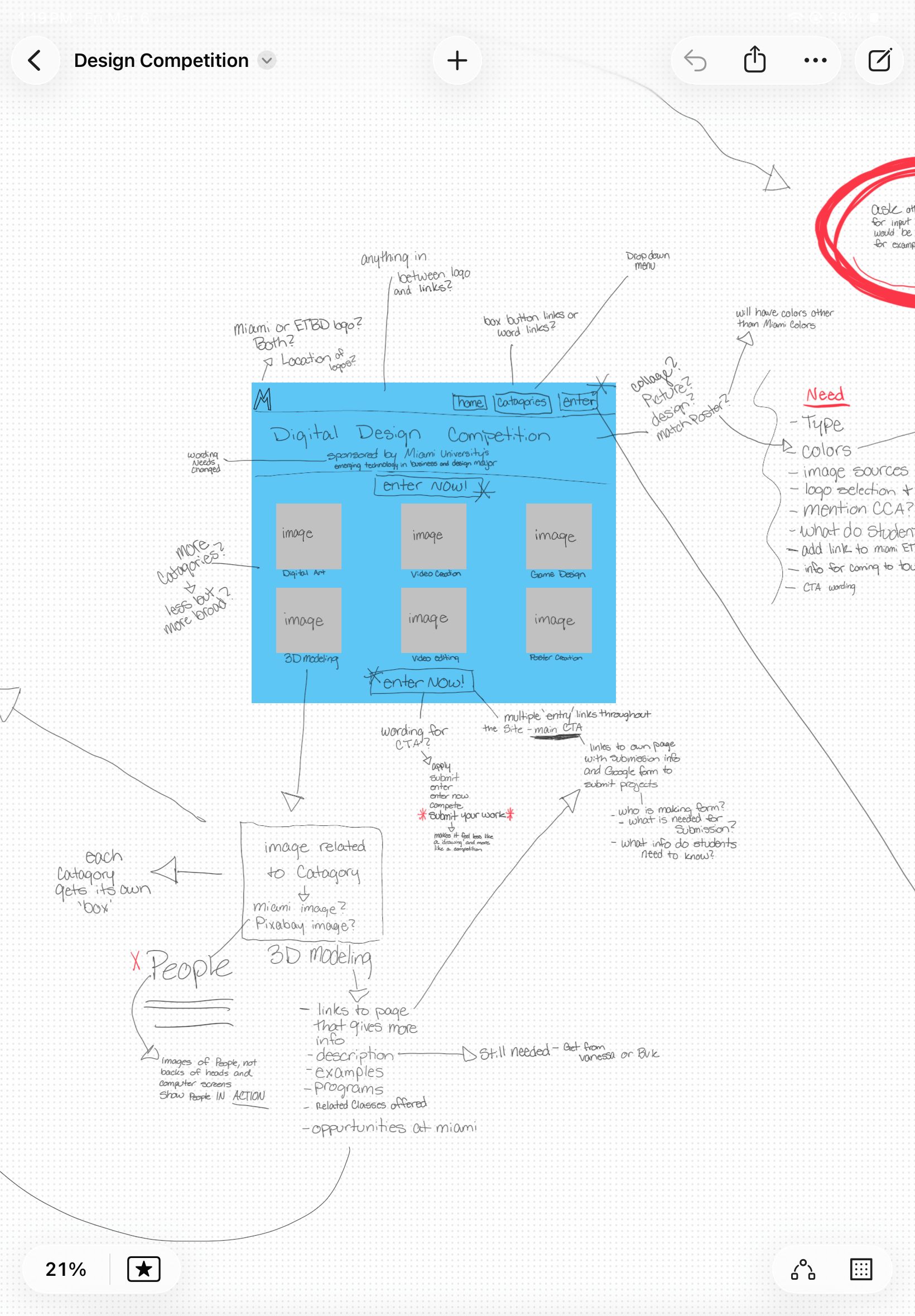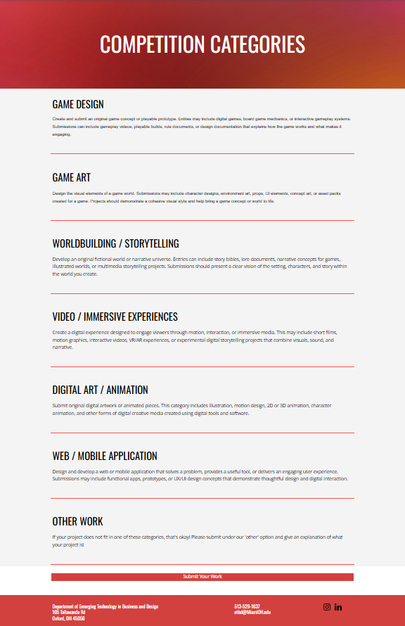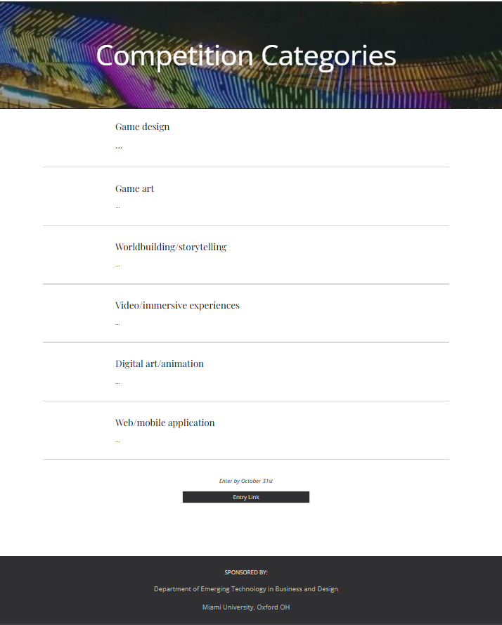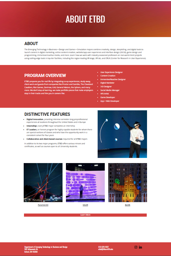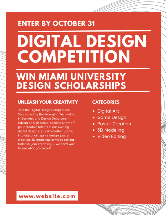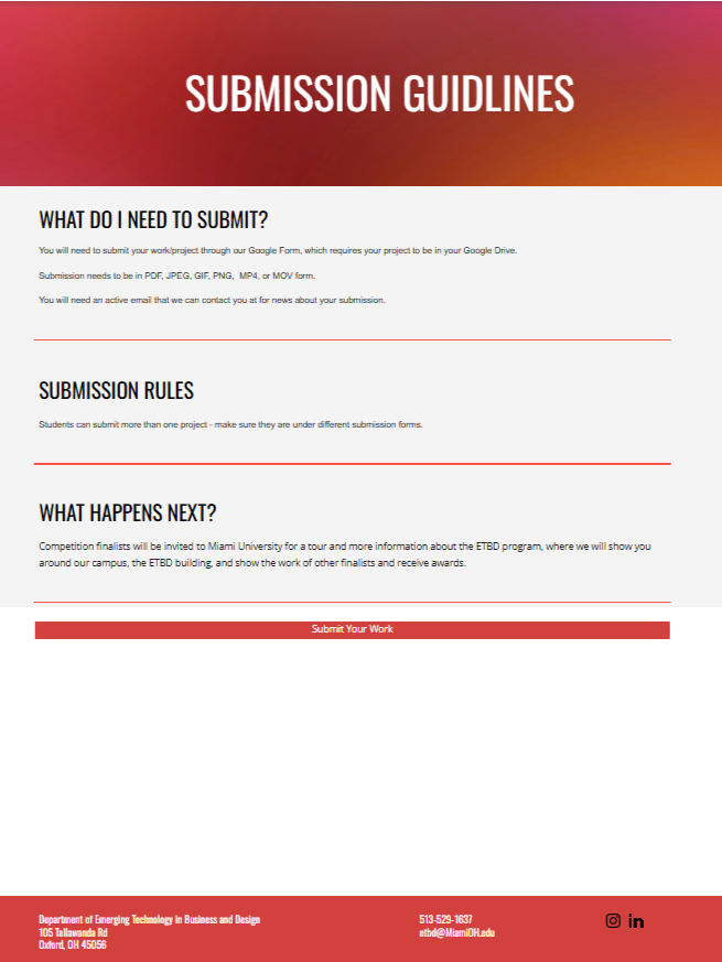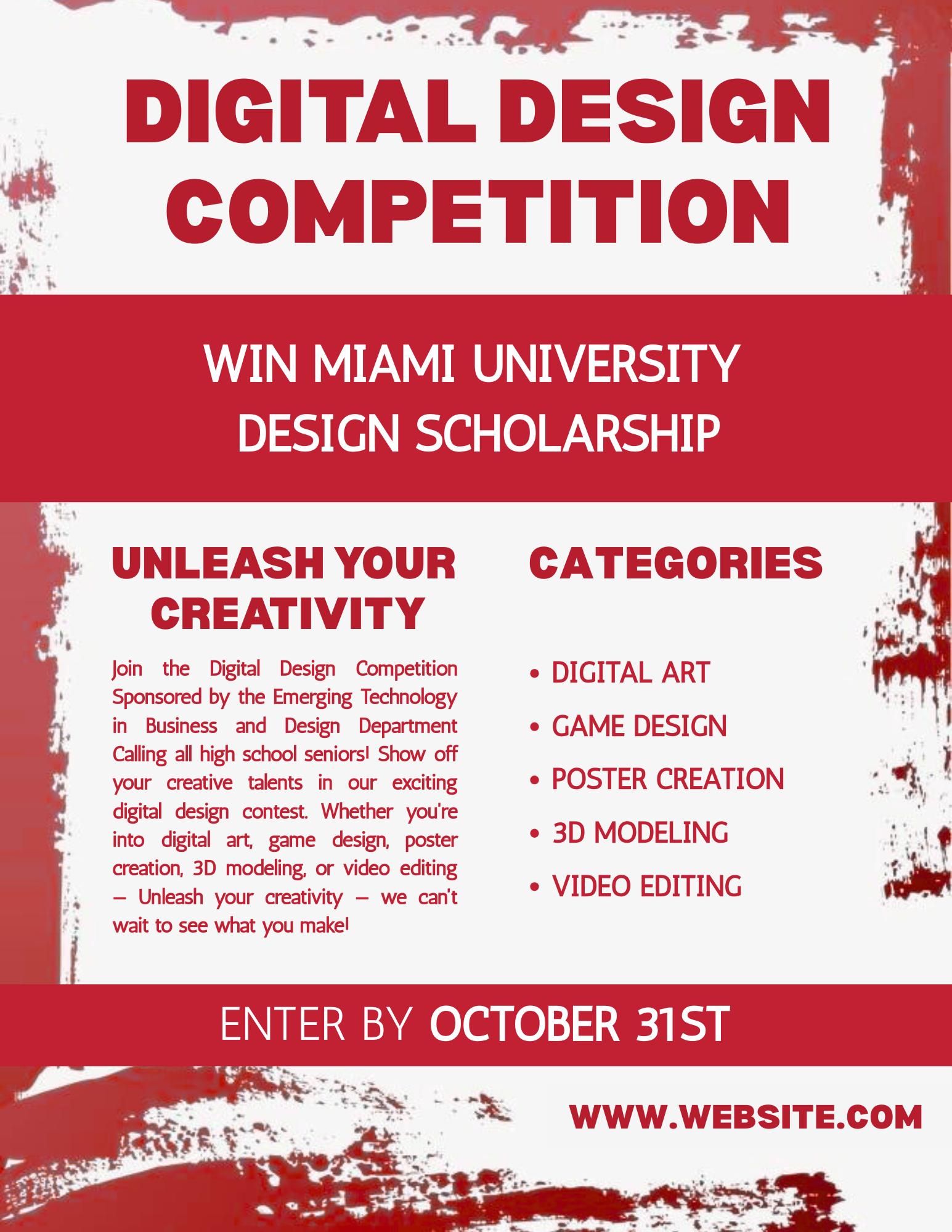 For this project, I collaborated with a partner to design promotional materials for Miami University’s ETBD Digital Design Competition, an initiative aimed at engaging high school students in creative fields. Our scope included both a digital poster and a companion website that would clearly communicate competition details while capturing the energy and creativity of the program. I contributed to both the poster and website design, with a particular focus on visual direction, layout, and key interface elements such as the website header. We used Canva for the poster design and Google Sites for the website build, requiring us to balance creativity with platform constraints.