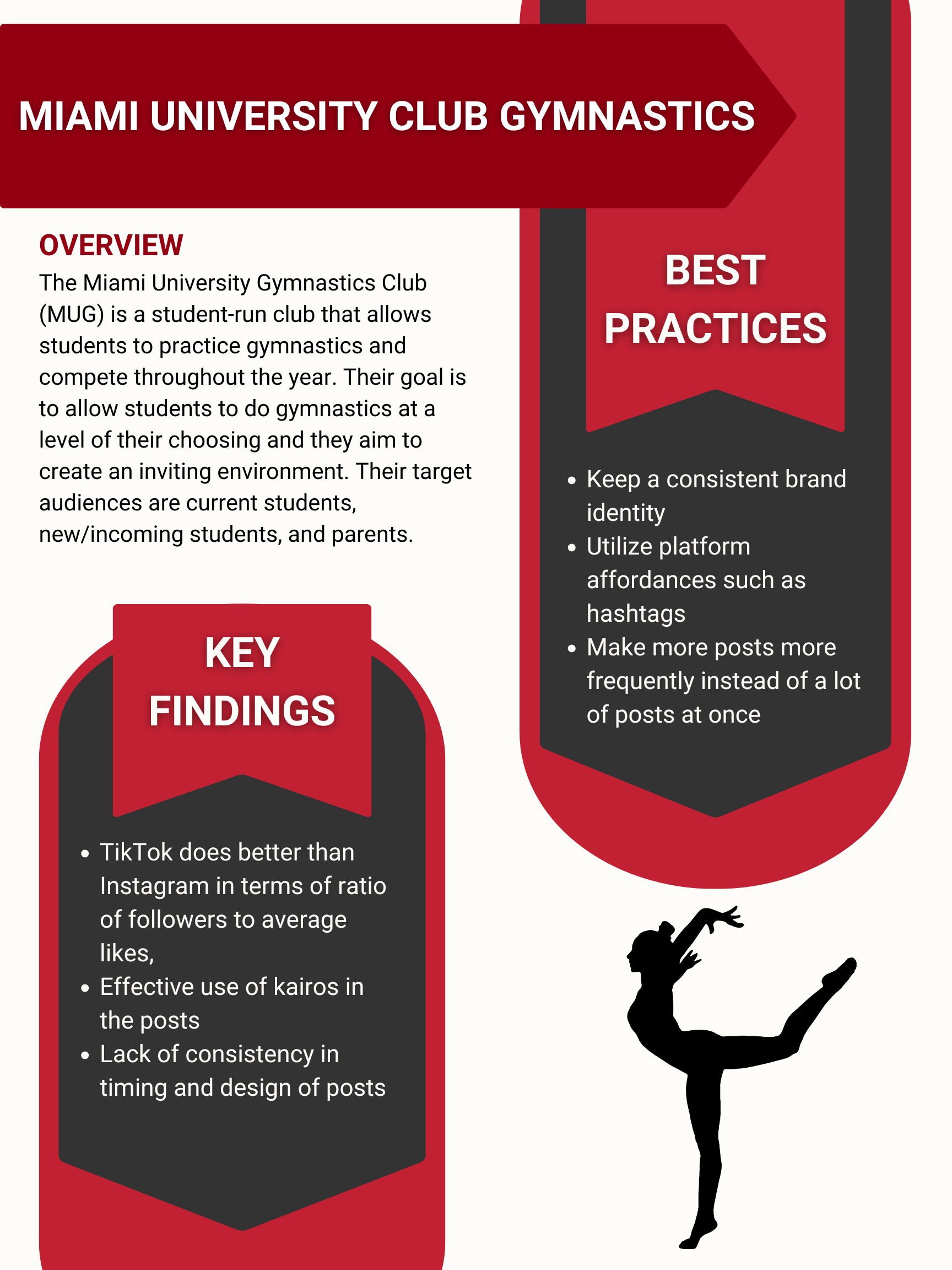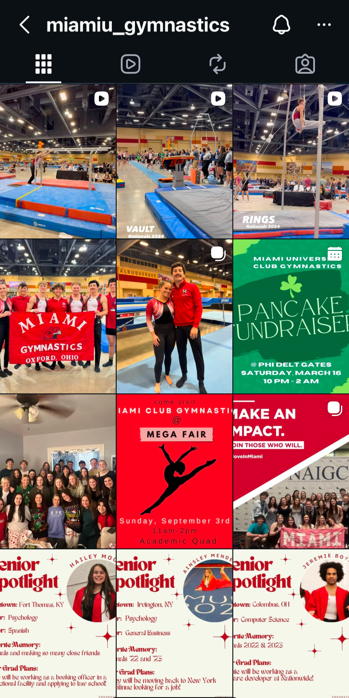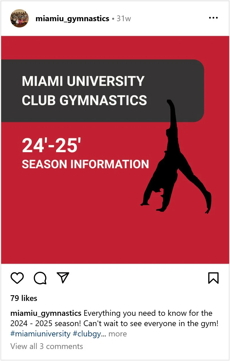 When looking at the Miami University Club Gymnastics social media presence I noticed it had strong community potential but lacked a structured content strategy and brand identity. To deal with this, I conducted platform and competitor research to identify growth opportunities, then implemented strategic adjustments to improve engagement and reach.